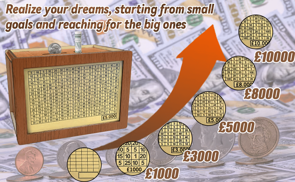 💸ACCURATE SAVINGS TRACKER: Our piggy bank panel offers a savings plan with a savings goal of $10,000, as you tick off more numbers the closer you get to your goal. With the ability to save both coins and cash, this piggy bank allows you to visually monitor your progress towards your financial goals, thus increasing your motivation and efficiency in saving.