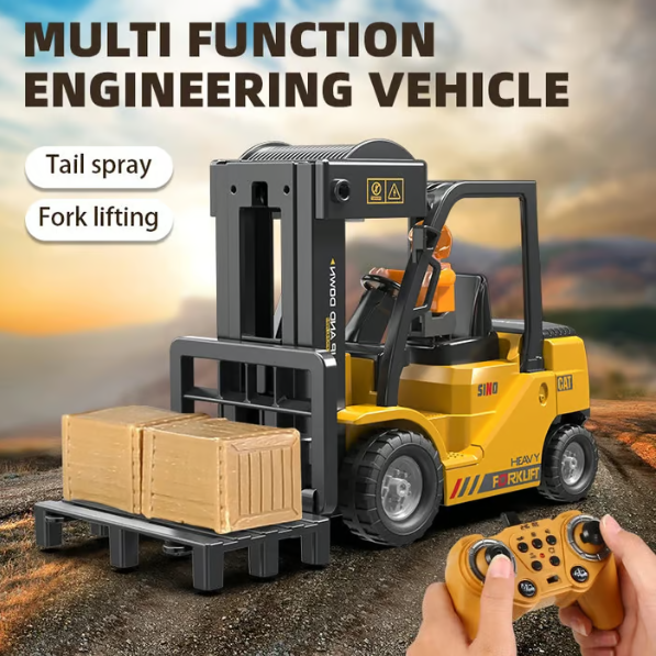 11 Channel RC Forklift: Forklift can go forward & backward, turn left & right, forklift pallet up & down, simulation sounds & lights, spraying, one key demo.