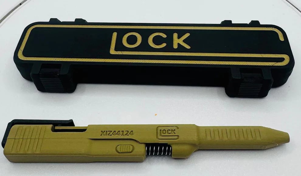 3D printed design inspired by the iconic Glock handgun (non-functional & safe) Fitted with a Pilot G2 ink refill – writes smoothly and can be replaced Lightweight, durable PLA body with a bold aesthetic Great as a desk statement piece, gift, or collector’s item Options available: Pen only Pen with a matching 3D printed case Pen with a matching 3D printed case and 2 different styles of holders (display stands)
